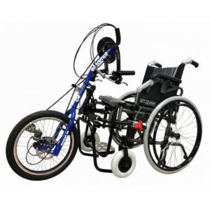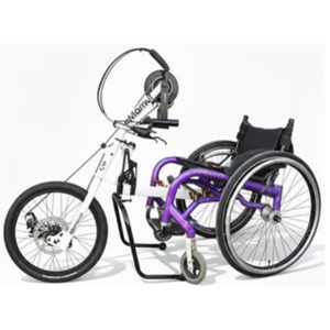Una handbike es un vehículo de movilidad adaptado para personas con discapacidad que afecta los miembros inferiores. Se acopla a la silla de ruedas y permite desplazarse pedaleando con las manos, ejercitando brazos, hombros y core. Las versiones eléctricas añaden un motor que asiste en el pedaleo.